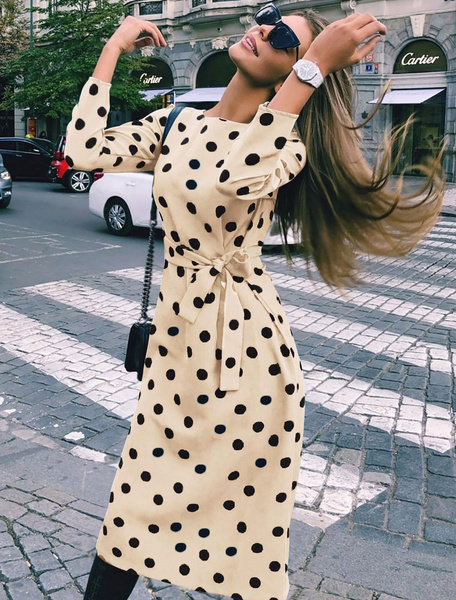Be the first to review “Round Neck Polka Dot Tie Waist Long Dress”