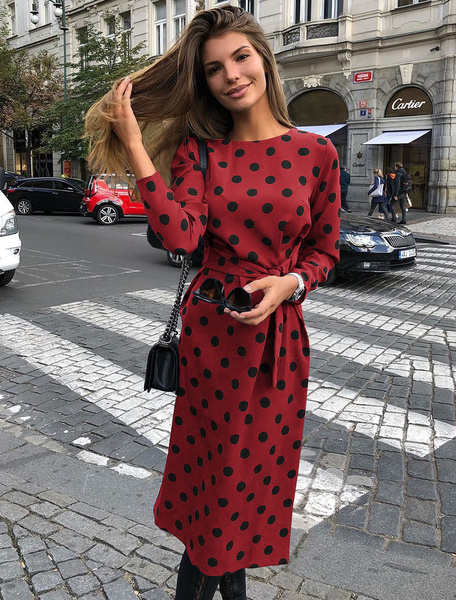 Round Neck Polka Dot Tie Waist Long Dress