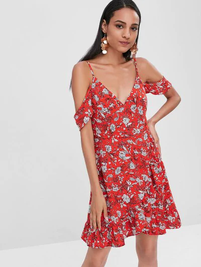 Romance meets flirt. This floral mini dress features a surplice bodice that is supported by the adjustable spaghetti straps and framed by the ruffled sleeves with a cold-shoulder design. An on-trend lace-up back design and a statement ruffle along the overlapping bottom are all which we adore! It is just the piece you should not miss.