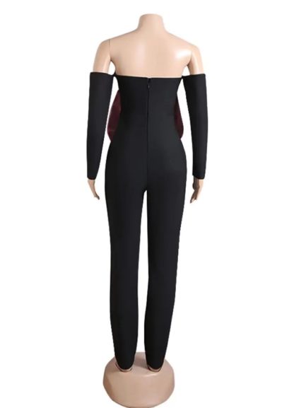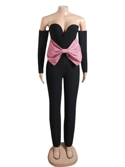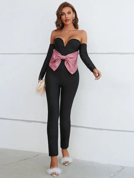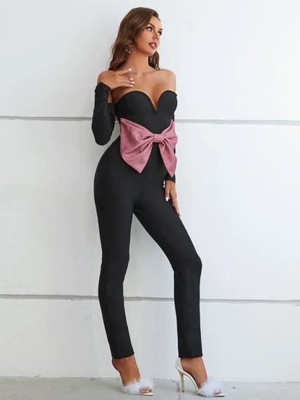Sexy Shiny Bow Patchwork Sleeveless Jumpsuit