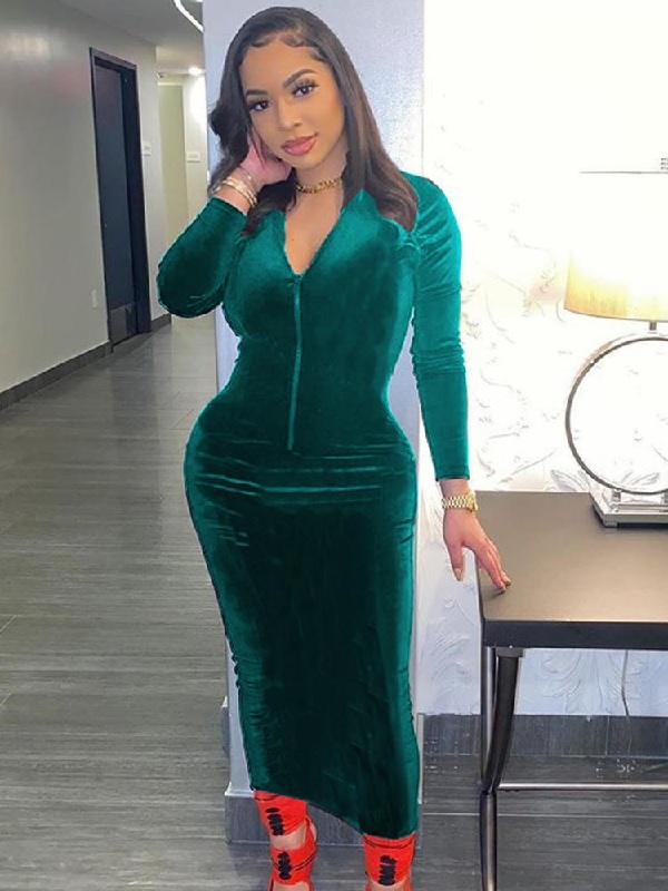 Sexy Velvet Zipper Long Sleeve Bodycon Dress