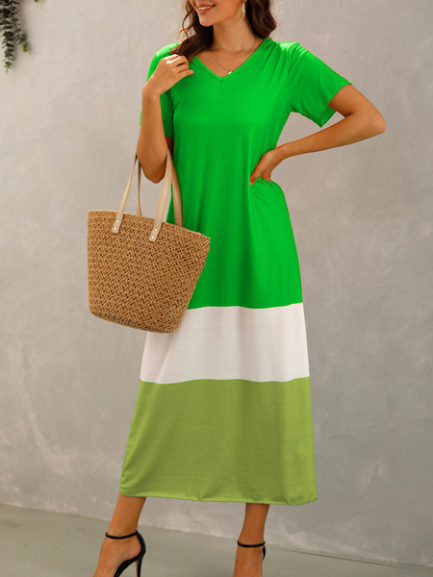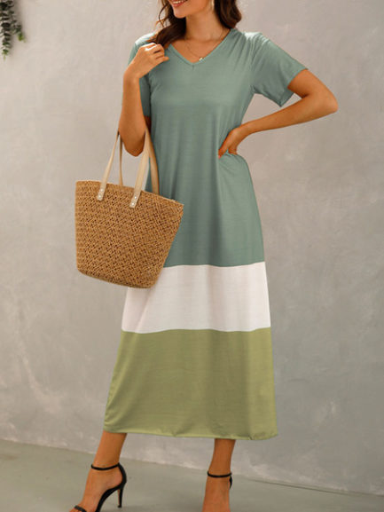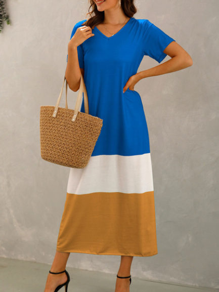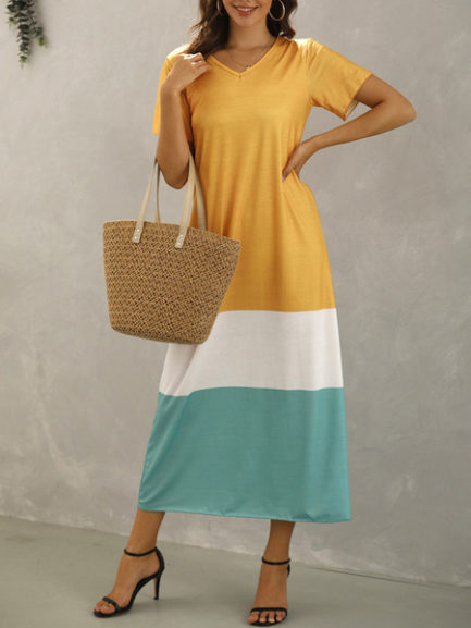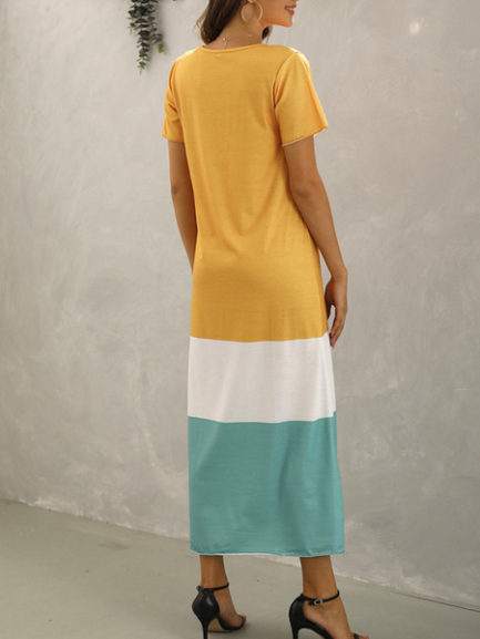 Short Sleeves Color Block Cotton Blend Maxi Dresses