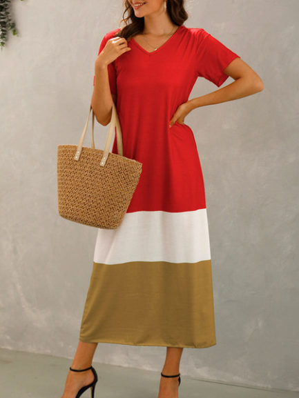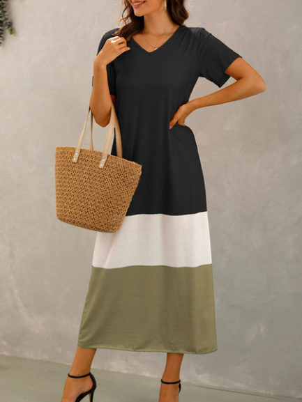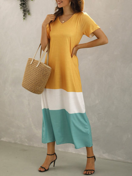 Be the first to review “Short Sleeves Color Block Cotton Blend Maxi Dresses”