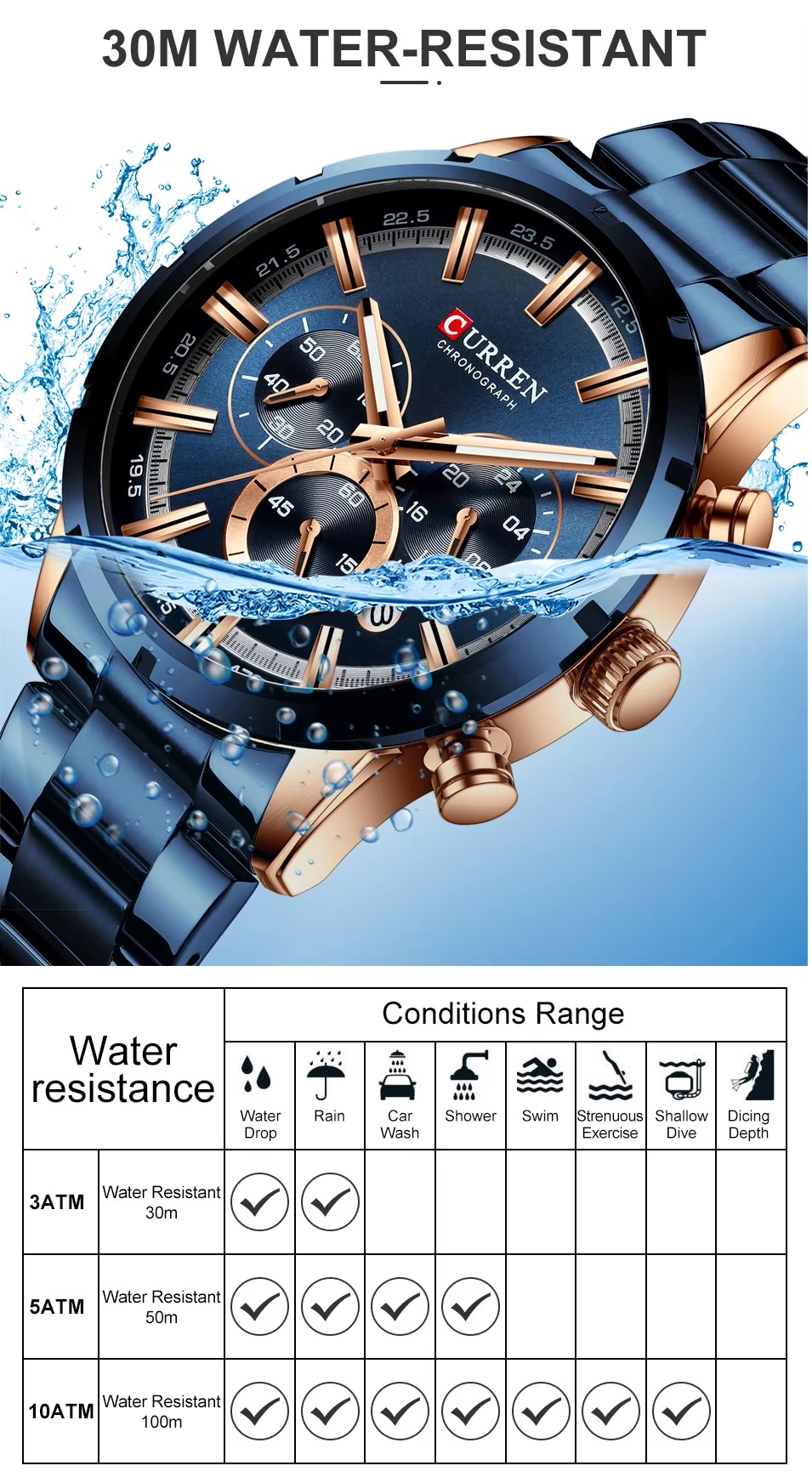 • Water Resistance Depth: 3Bar