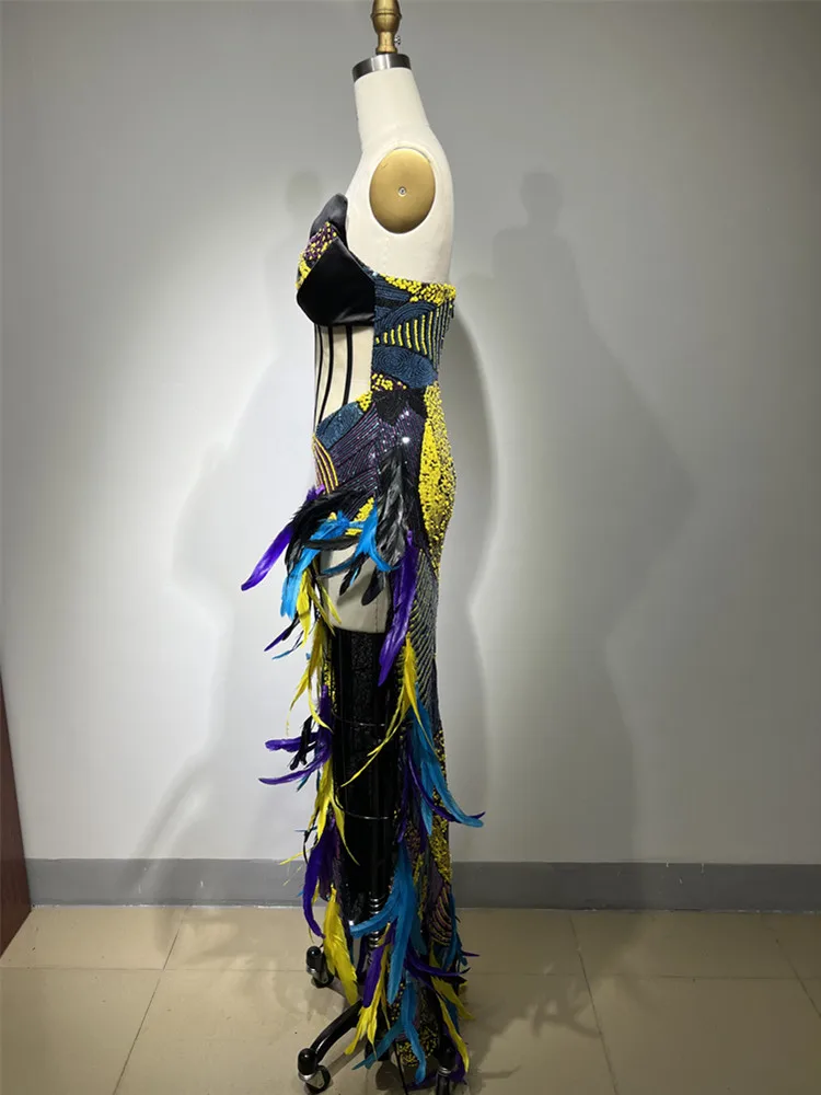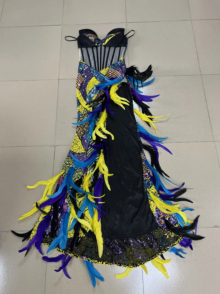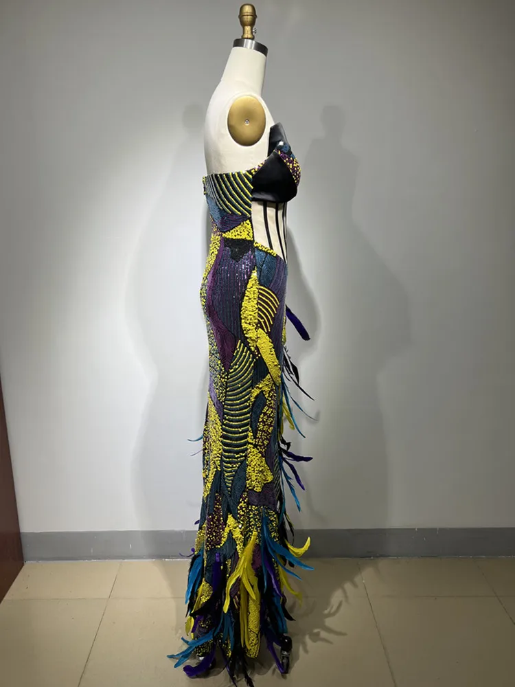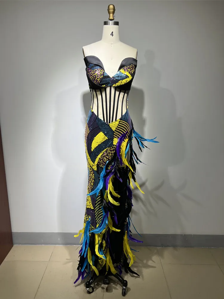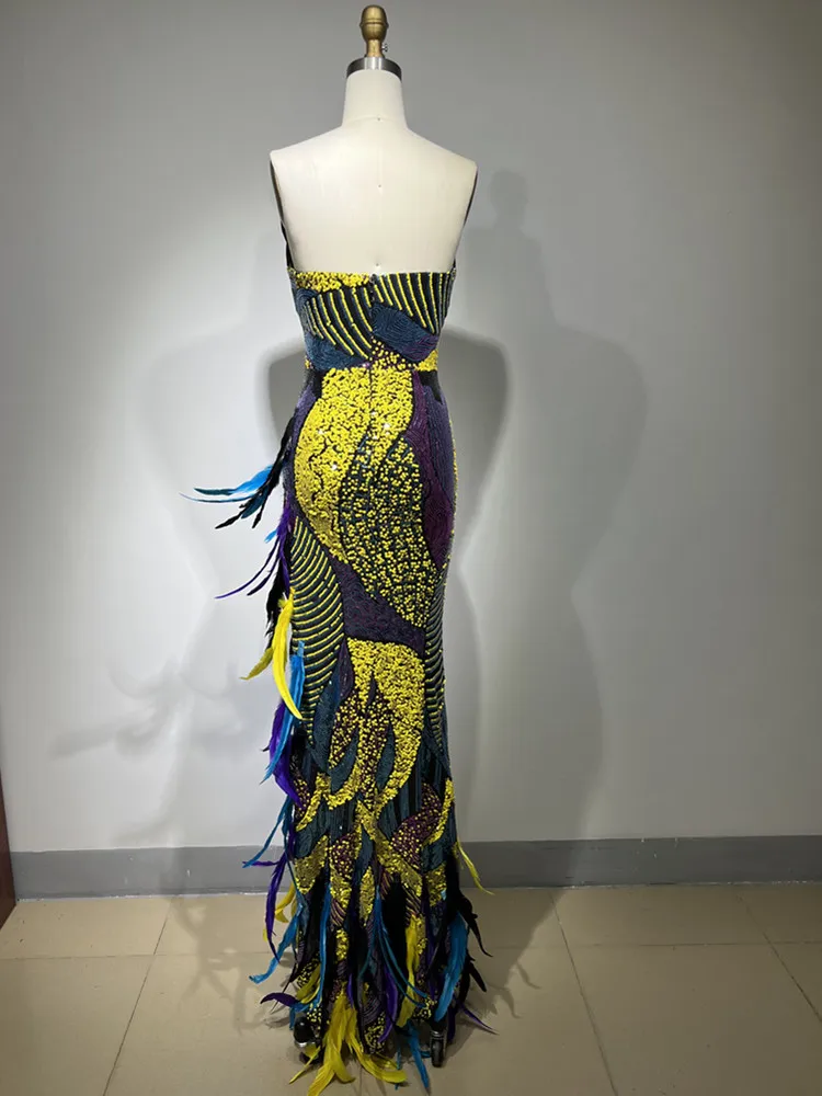 Strapless Backless Sequins Feather Elegant Party Evening Stage Performance Maxi Long Dress