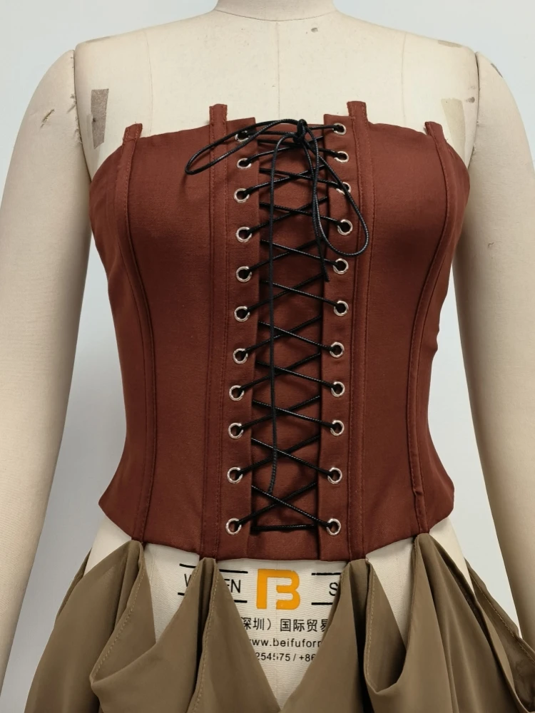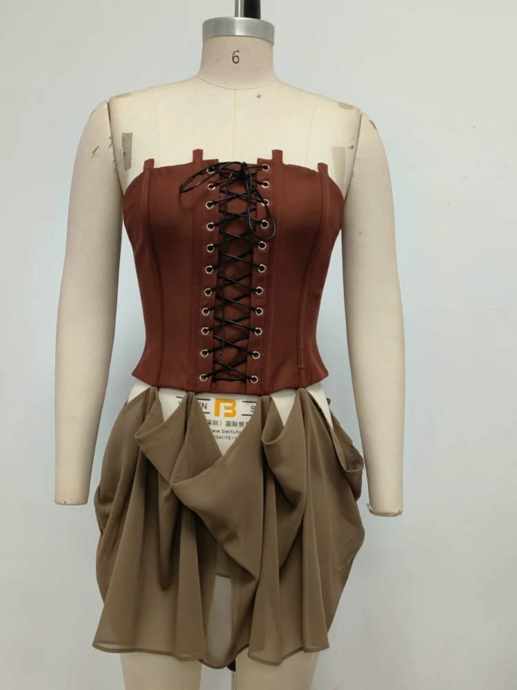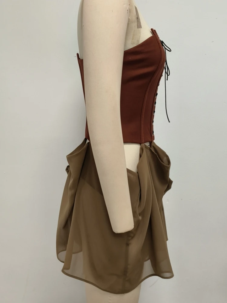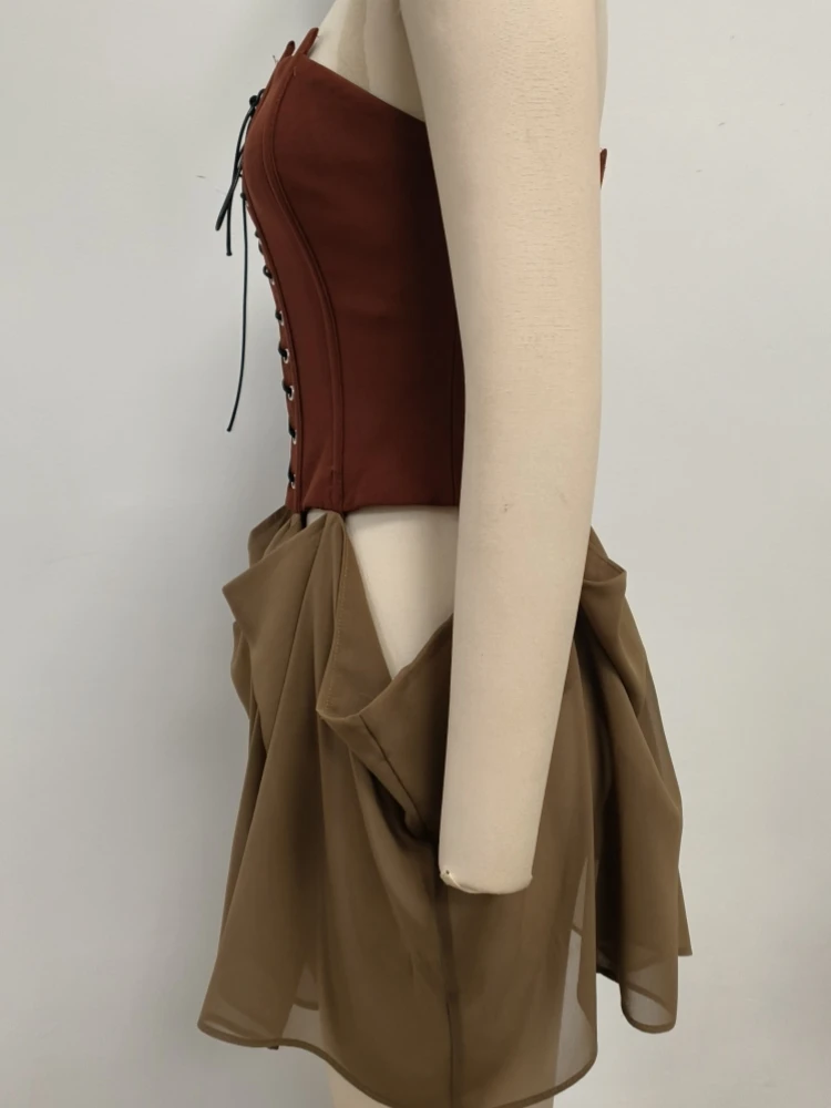 Strapless Lace-Up Design Patchwork Hollow Out Dresses Evening Party Cocktail Mini Dress