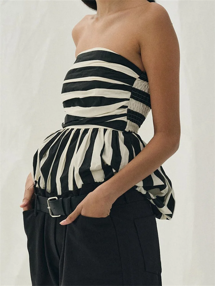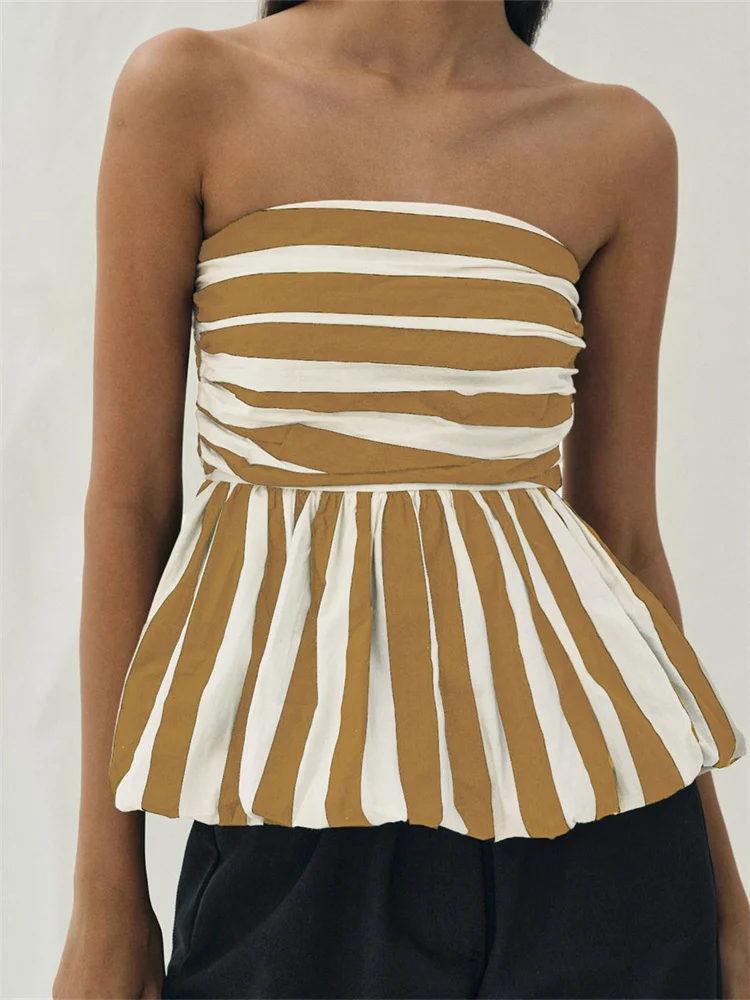 Strapless Striped Print Ruched Backless Off Shoulder Ruffles Hem Tank Tube Tops