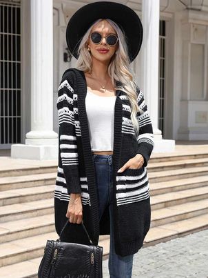 Sweaters Cardigans Stripes Long Sleeves Hooded Outerwear