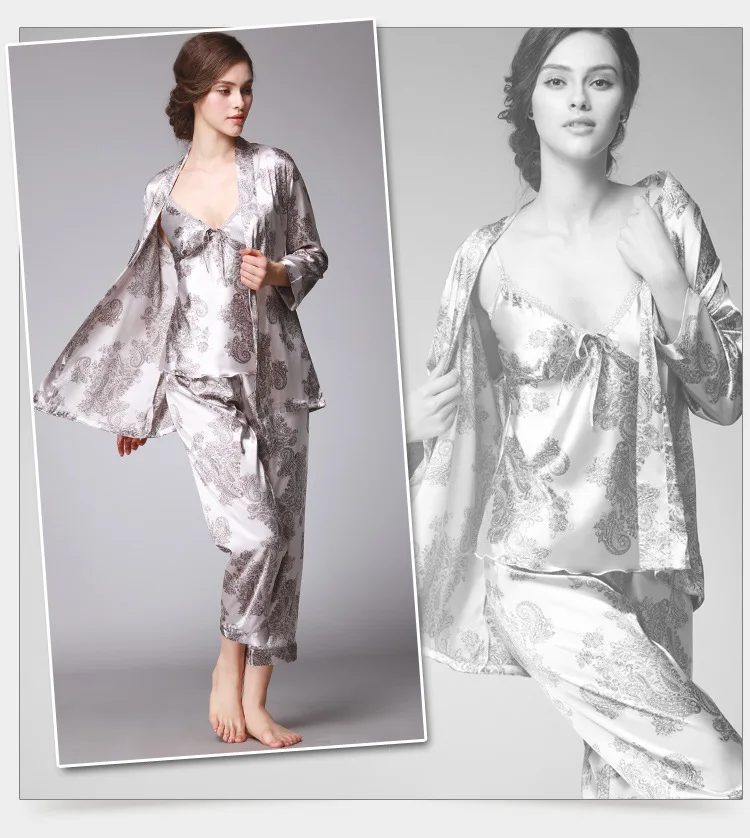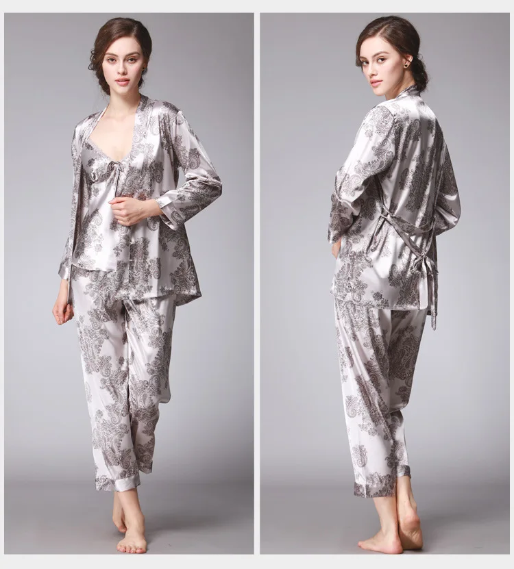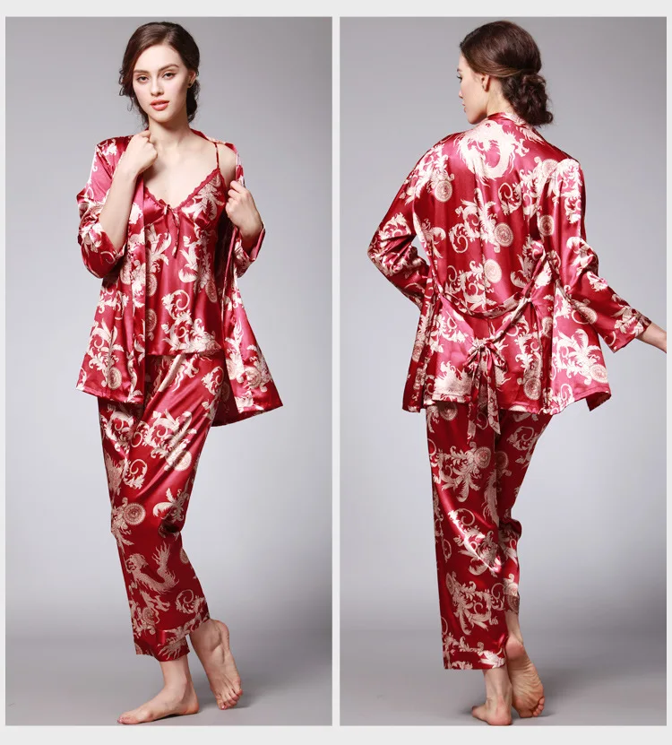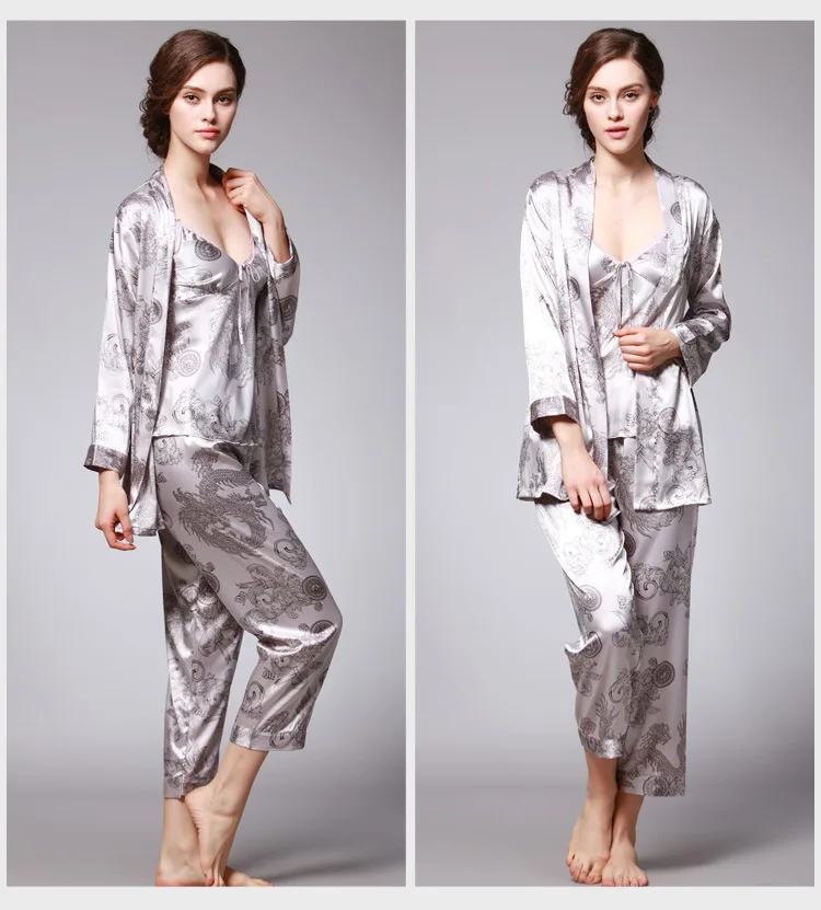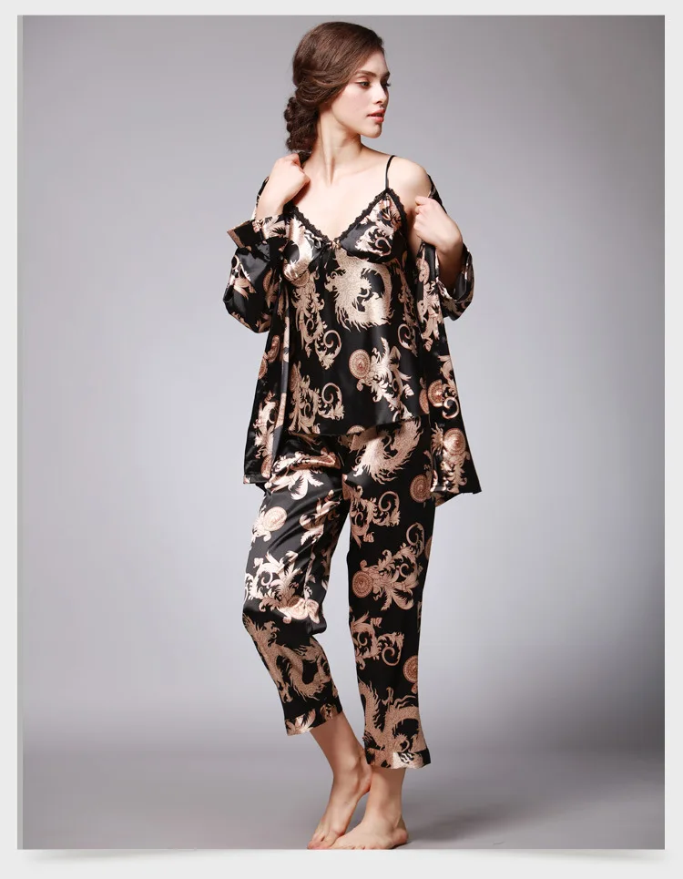 Three Piece Nightwear Silk Like Dragon Printed Lingerie