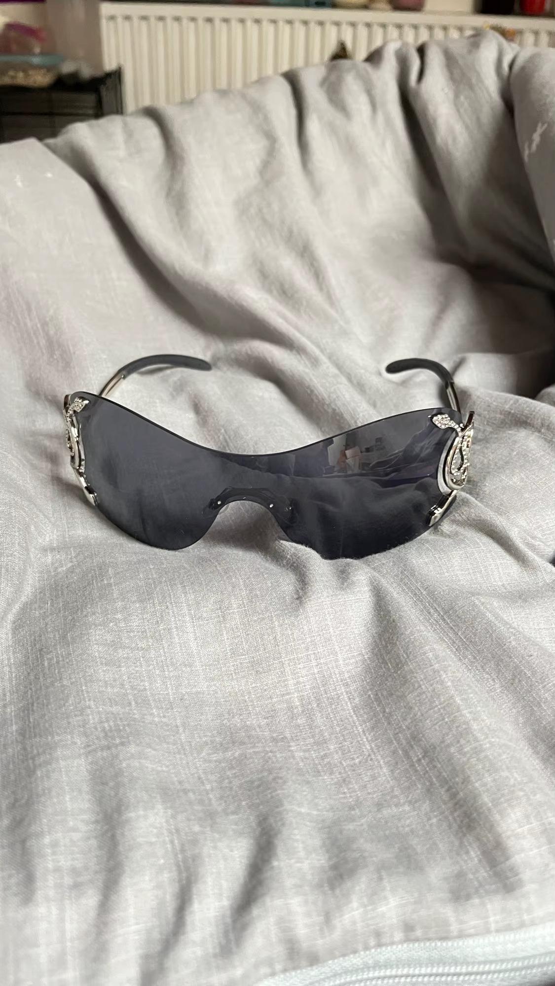 Be the first to review “Trendy Rimless Gradient Snake Shaped Mirror Leg Oversized Sunglasses”