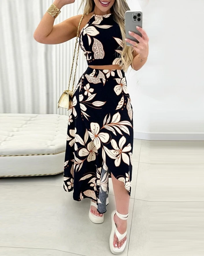 Two Piece Set Women Outfit Summer Floral Print Halter Backless Tied Detail Top & Casual Beach Vacation Maxi Slit Skirt Set