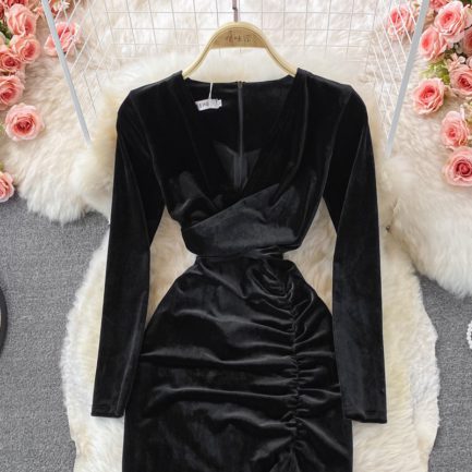 V-Neck Draped Bodycon Dress Long Sleeve