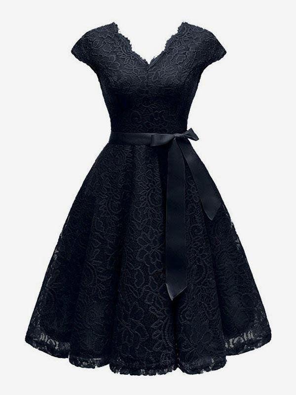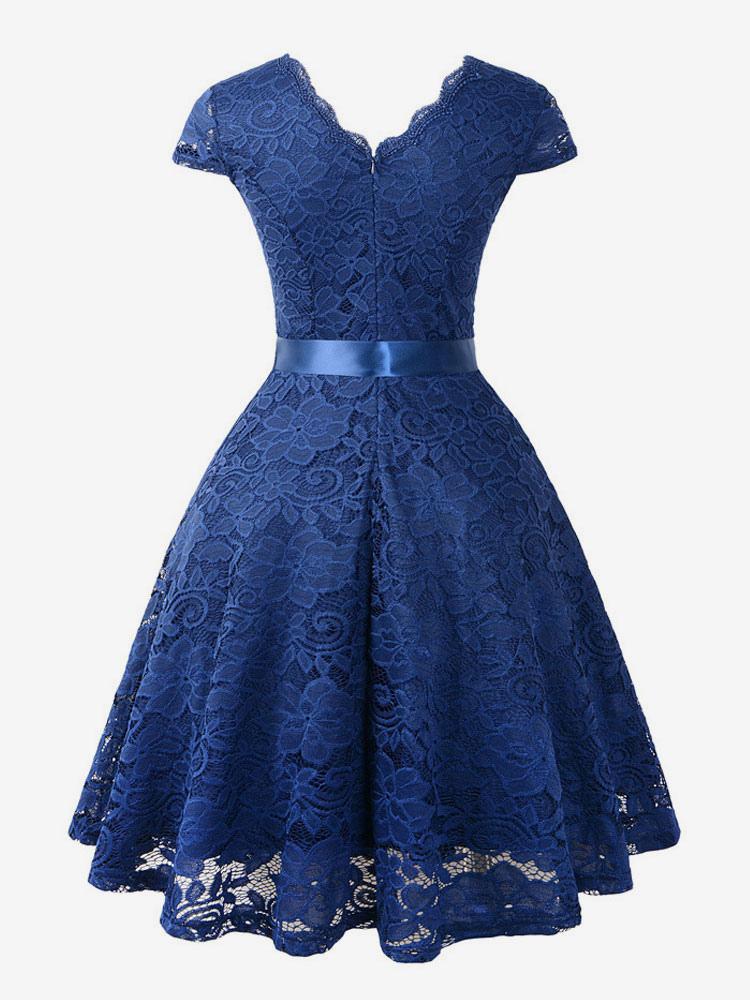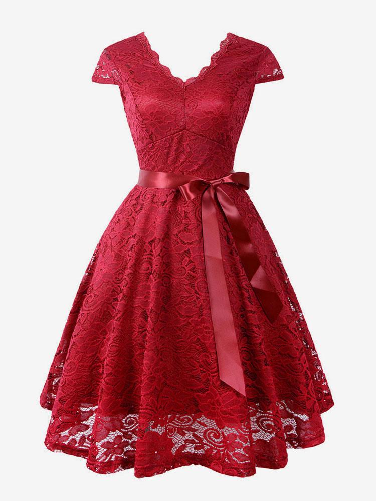 Be the first to review “Vintage Lace Dress 1950s V Neck Cap Sleeve Bow Sash Retro Swing Dress”