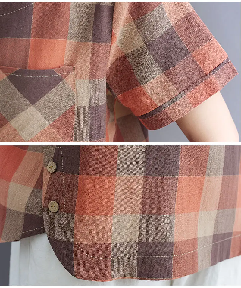 Be the first to review “Vintage Plaid Print Pocket Round Neck Short Sleeve Loose Cotton Linen Shirts Blouses”