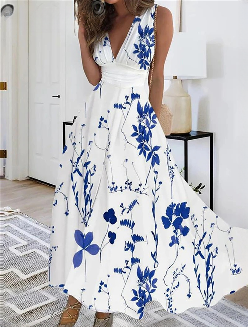 Deep V Neck High Waist Sleeveless Vest Dress Elegant Print Party Wedding Dresses