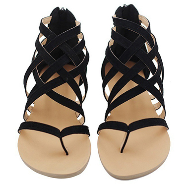 The look of a pair of flip flops and cross strap gladiators have come together in the look of these sandals. The soles have a light brown color. These are well constructed and study soles. They are made from a taupe colored set of straps. They has a traditional flip flop style in the toe area. A set of cross strap have been added in a mock gladiator style in the ankle area. These sandals look great and can easily be worn all day long on a warm day.