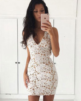 Look as sweet as a spring day when you are in this dress. It is a lined dress which has been given a very lovely look. The lining of the garment is a sleeveless dress which has a mini hemline. The overlay of the dress is made of a large design lace fabric. The top has a V style neckline. This dress is held up by over the shoulder straps. The body has a more fitted style. This garment has a high style waist. The over lay skirt which has been added to the waist has an inverted hemline. This skirt comes up to the middle thigh are in the front. The back of the skirt goes to the ankle area in the middle. This is a dress which looks best when worn with a pair strap style high heels. Wear this dress with some of your delicate accessories.
