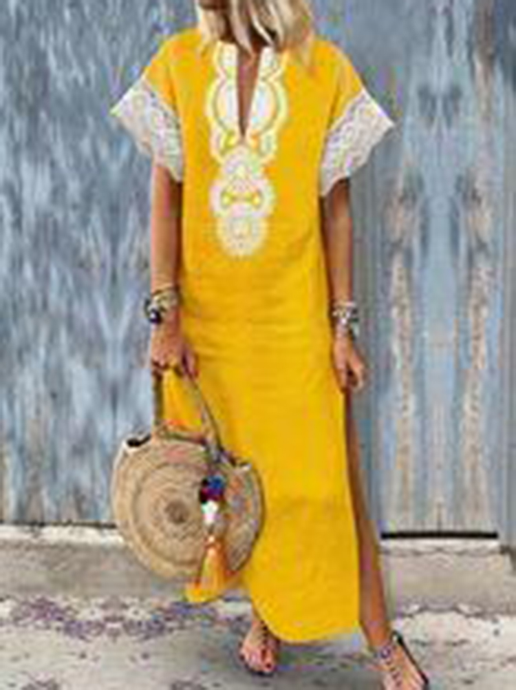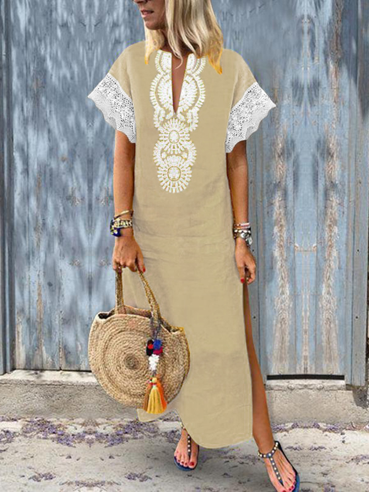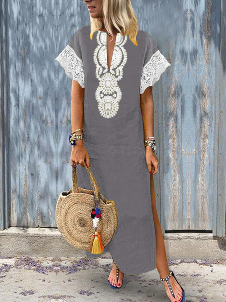 Women Lace Patchwork Short Sleeve V-Neck Baggy Boho Split Hem Maxi Dress