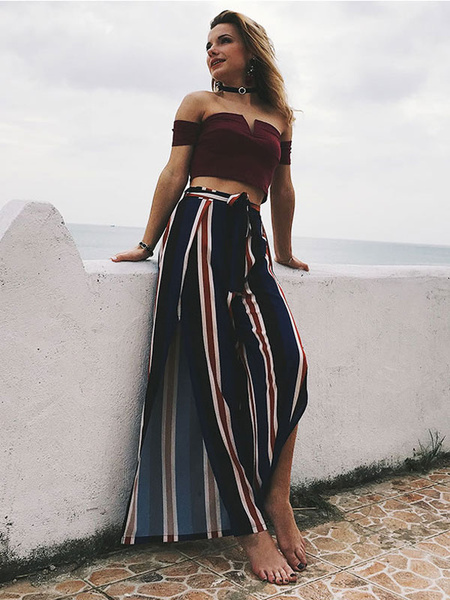 Women Pants Striped Deep Blue Split Wide Leg Pants