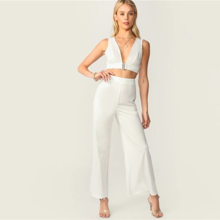 Women Plunging Neck Top And High Waist Palazzo Pants Set