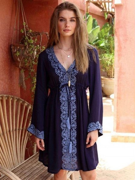 Women V Neck Long Sleeves Mini Dress