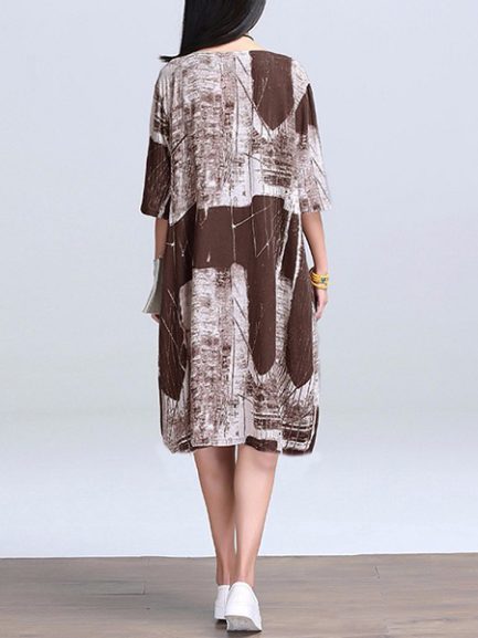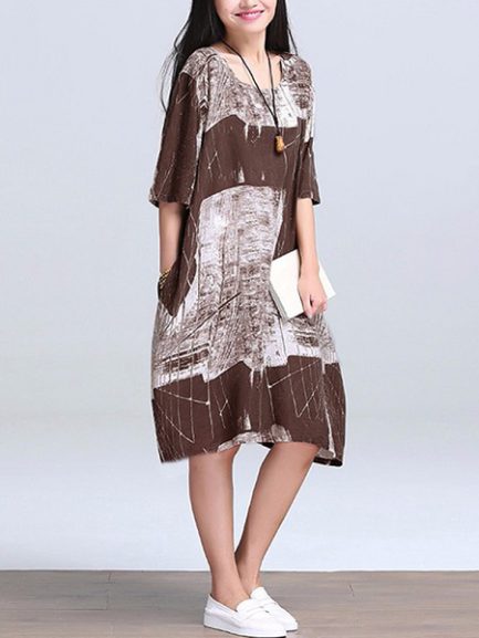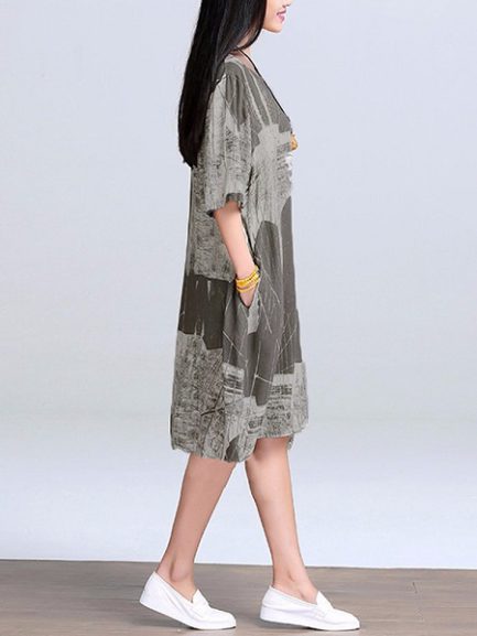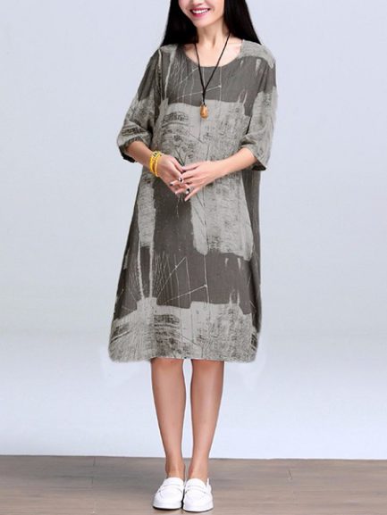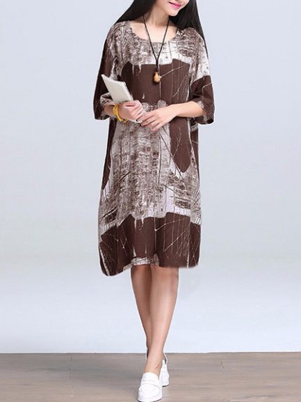 Women Vintage Cotton Linen Print Kaftan Style Dress